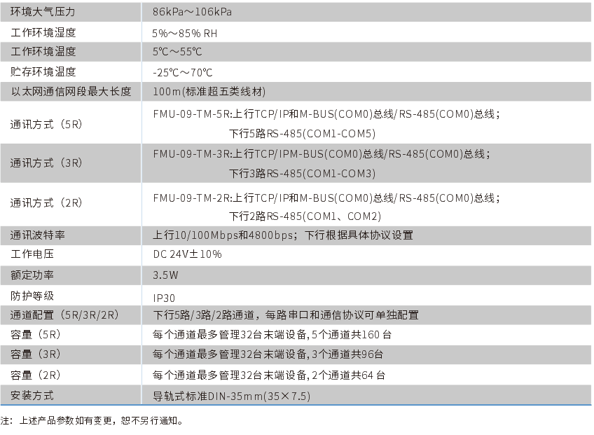 FMU-09-TM(TR)-5R/3R/2R區(qū)域管理器主要用于將多種協(xié)議設(shè)備接入柏誠系統(tǒng)。下行RS485通信接口,也可通過加配RS485轉(zhuǎn)M-BUS轉(zhuǎn)換器支持M-BUS總線,下行總線連接末端設(shè)備,支持的協(xié)議有:柏誠一體化協(xié)議,Modbus-RTU、Modbus-TCP、DL/T645-1997、DL/T645-2007、CJ/T188-2004、EN1434等通信協(xié)議,支持非標準或廠家私有協(xié)議的定制開發(fā)。上行以太網(wǎng)TCP接口和M-BUS/RS485總線接入柏誠系統(tǒng)。