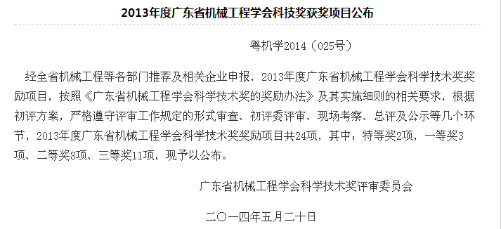 廣東省機械工程學會科學技術獎是為獎勵對我省科學技術進步作出突出貢獻的公民和組織,調動科學技術工作者的積極性和創(chuàng)造性,推動科技進步做出貢獻而設計。2013年度廣東省機械工程學會科學技術獎共獎勵特等獎2項,一等獎3項、二等獎8項、三等獎11項。