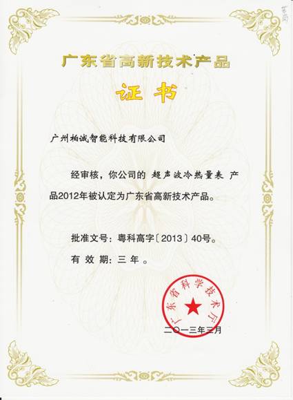 2013年4月,廣州柏誠智能科技有限公司產品“超聲波冷熱量表” 獲得廣東省科學技術廳頒發(fā)的“廣東省高新技術產品證書”(粵科高字[2013]40號)。