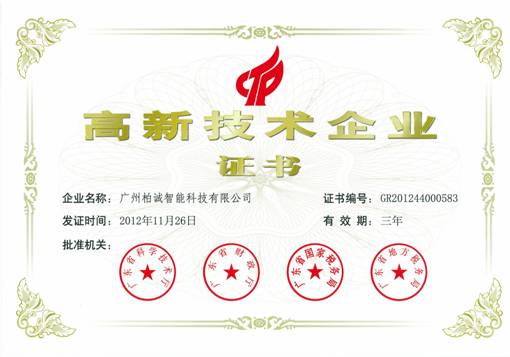 根據(jù)《高新技術(shù)企業(yè)認(rèn)定管理辦法》(國科發(fā)火〔2018〕172號)和《高新技術(shù)企業(yè)認(rèn)定管理工作指引》(國科發(fā)火〔2008〕362號)的相關(guān)規(guī)定,經(jīng)專家嚴(yán)格審查和答辯等程序,廣州柏誠智能科技有限公司再次獲得廣東省2012年第二批高新技術(shù)企業(yè)認(rèn)證,證書編號:GR201244000583。