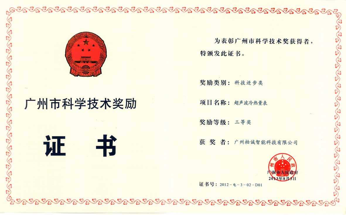 根據(jù)《廣州市科學(xué)技術(shù)獎(jiǎng)勵(lì)辦法》和《廣州市科學(xué)技術(shù)獎(jiǎng)勵(lì)辦法實(shí)施細(xì)則》的規(guī)定,經(jīng)廣州市科學(xué)技術(shù)獎(jiǎng)評(píng)審委員會(huì)公正嚴(yán)格的評(píng)定后,已將評(píng)定的2012年廣州市科學(xué)技術(shù)獎(jiǎng)獲獎(jiǎng)項(xiàng)目進(jìn)行公示。廣州柏誠智能科技有限公司“超聲波冷熱量表”成果通過鑒定,達(dá)到國內(nèi)領(lǐng)先水平,獲得2012年廣州市科學(xué)進(jìn)步三等獎(jiǎng)(電-3-14)。