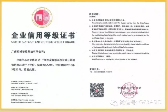 近日,我公司收到由國家商務(wù)部和國務(wù)院國資委頒發(fā)的《企業(yè)信用等級證書》。在經(jīng)過3個(gè)月的評審考核中,柏誠智能榮獲商務(wù)部信用工作辦公室以及中國中小企業(yè)協(xié)會信用管理中心各項(xiàng)專家評審最終獲得評定為“AAA級”。并在中華人民共和國商務(wù)部官網(wǎng)以及中國市場秩序網(wǎng)進(jìn)行備案和公示查詢。